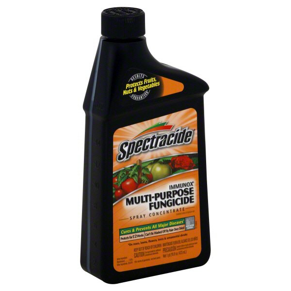 Spectracide Immunox Multi-Purpose Fungicide Spray Concentrate For Gardens Protects fruits nuts and vegetables Cures and prevents all major diseases on roses lawns flowers trees and ornamental shrubs Protects for up to 2 weeks Cant be washed off by rain once dried Controls brown patch powdery. Spectracide Immunox Multi-Purpose Fungicide for Gardens is a multi-purpose fungicide formulated to provide systemic protection against lawn and ornamental plant disease. Spectracide immunox fungus plus insect control for lawns cant be washed off by rain.